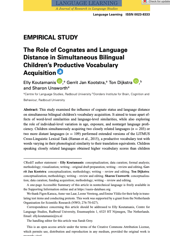 📣 New paper alert, with Elly Koutamanis, Gerrit Jan Kootstra and Ton Dijkstra📣 🔎 What’s the paper about? ▶ Whether similarities between languages influenced how well bilingual children children performed on a vocabulary task in Dutch.▶ We investigated similarities at the level of specific words (cognates vs. non-cognates) and in terms of language distance.▶ We […]